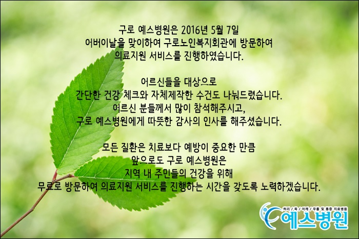구로 예스병원은 2016년 5월 7일 어버이날을 맞이하여 구로노인복지회관에 방문하여 의료지원 서비스를 진행하였습니다.